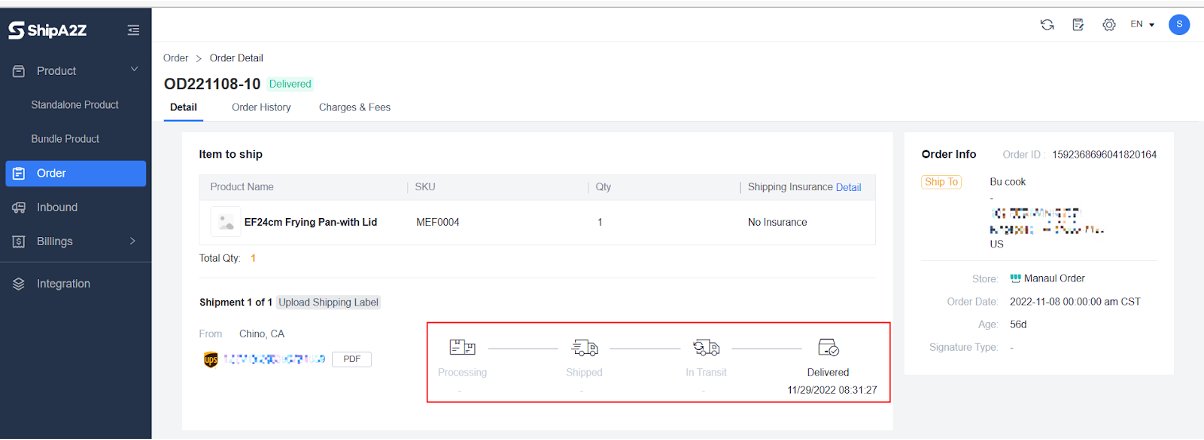The warehouse will synchronize with the OMS system after completing the fulfillment. The customer can click the order to check the status. The status of “shipped” indicates that the warehouse has completed the shipment; “in transit” and “completed” means the carrier shipping status. And when the parcel is delivered successfully, the “Completed” status will be displayed.